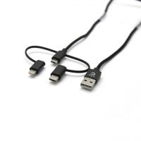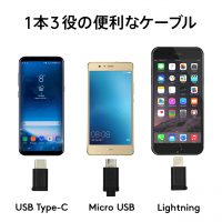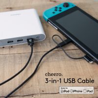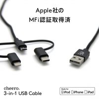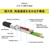 • cheeroから、3種の差込口に対応した3-in-1ケーブルが登場です。Lightning, USB-C, Micro USB対応で1本3役。長さはちょうど良い100cmでお出掛けの際にこれ1本でOK。鞄の中でケーブルが絡まる生活とさよなら。