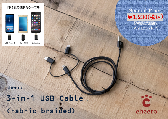 cheero、3種の差込口に対応した3-in-1ケーブル「cheero 3-in-1 USB Cable (Fabric braided)」を発売
