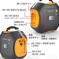 - cheeroから、AC/DC/USB出力可能な、LEDライト付き超大容量バッテリーの登場です!日本の電化製品に合わせた電圧100Vの出力が可能で、超大容量なのにわずか5.4kg!サイズは270 × 315 × 170 mm とコンパクトサイズ!電源のない屋外での作業やキャンプにも役立つ優れもの。災害・停電時にも頼れる便利なバッテリーです。
