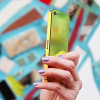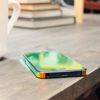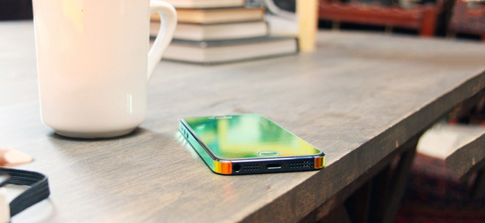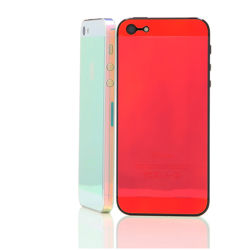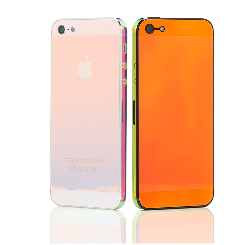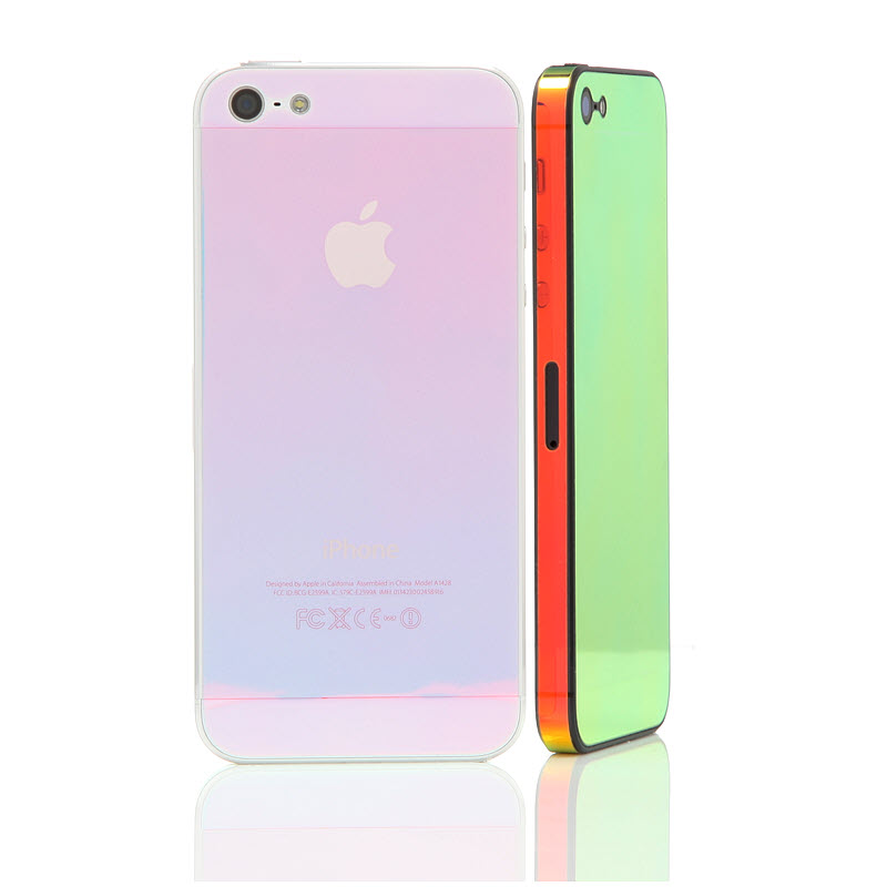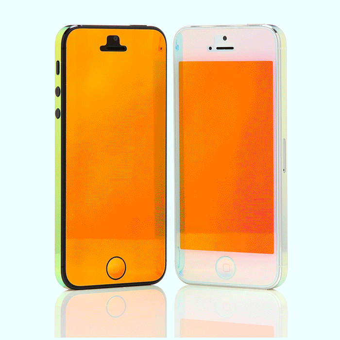 見る角度によって黄金色、エメラルドグリーン、オーシャンブルーなど、 玉虫色に変化するiPhone5用オーロラフィルム