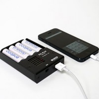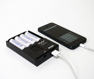 市販のあらゆる単三乾電池が使えます。マンガン・アルカリ・ニッケル水素電池の他に特殊なエボルタや充電タイプのエネループが使えます。又、入出力が電気的に絶縁されているので乾電池に異常が起きた場合もiPhoneに影響を与えません。