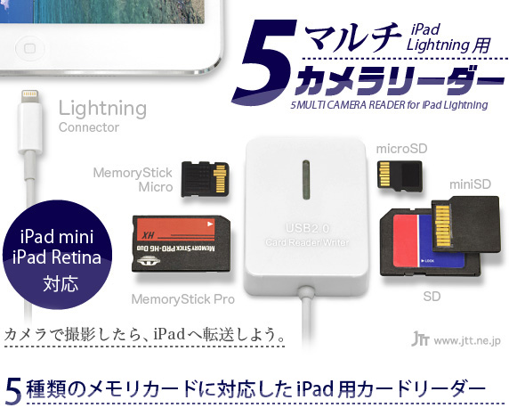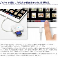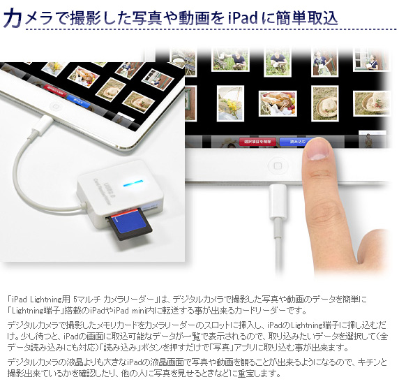 「iPad Lightning用 5マルチ カメラリーダー」は、デジタルカメラで撮影した写真や動画のデータを簡単に「Lightning端子」搭載のiPadやiPad mini内に転送する事が出来るカードリーダーです。