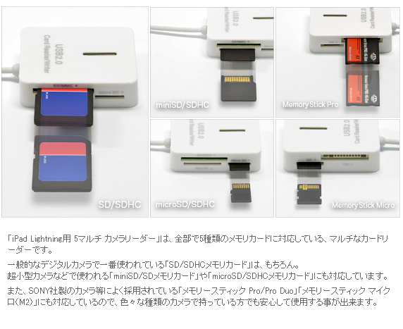 「iPad Lightning用 5マルチ カメラリーダー」は、全部で5種類のメモリカードに対応している、マルチなカードリーダーです。一般的なデジタルカメラで一番使われている「SD/SDHCメモリカード」は、もちろん。超小型カメラなどで使われる「miniSD/SDメモリカード」や「microSD/SDHCメモリカード」にも対応しています。また、SONY社製のカメラ等によく採用されている「メモリースティック Pro/Pro Duo」「メモリースティック マイクロ(M2)」にも対応しているので、色々な種類のカメラを持っている方でも安心して使用する事が出来ます。