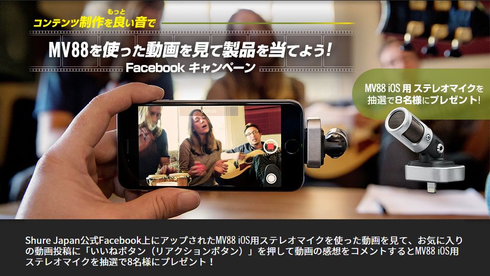 Shure Japan 公式 Facebook 上にアップされた MV88 iOS 用ステレオマイクを使った動画を見て、お気に入りの 動画投稿に「いいねボタン(リアクションボタン)」を押して動画の感想をコメントすると MV88 iOS 用ステレ オマイクを抽選で 8 名様にプレゼントいたします!