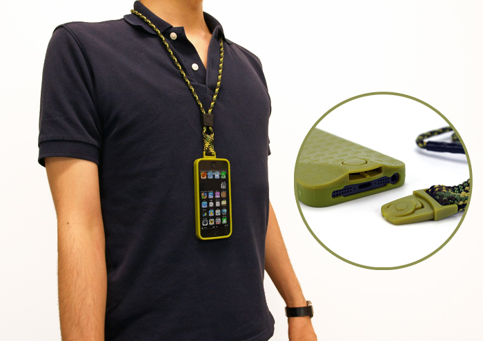 ・首から提げるストラップと一体になったiPhone5用ケース。