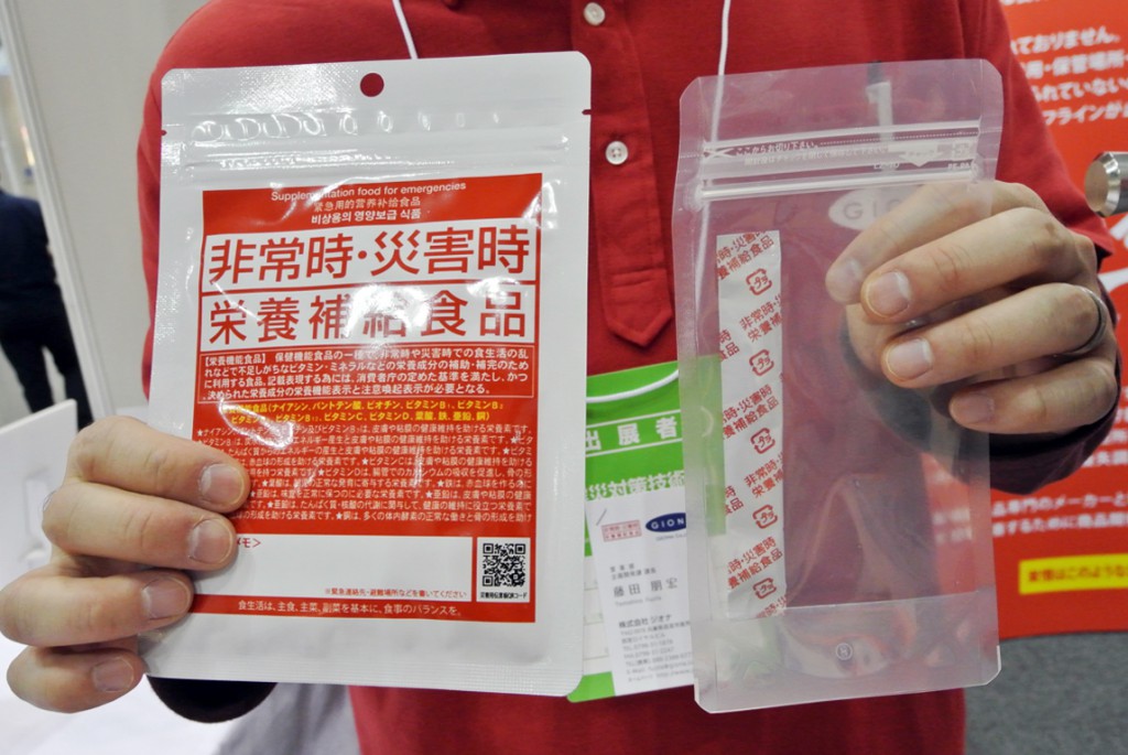 災害時の食事は、炊き出しや配給のパン、おにぎりなど栄養が偏りがちになってしまう。栄養が偏った状態が長く続くと、体力が落ちたり、疲れやすくなってり、衰弱やストレスにより体調が悪化してしまったりするという。「非常時・災害時栄養補給食品」は、必要なビタミン、ミネラルを5年間の賞味期限の間基準値を維持する「栄養機能食品」であり、水無しでも飲めるよう工夫されている。