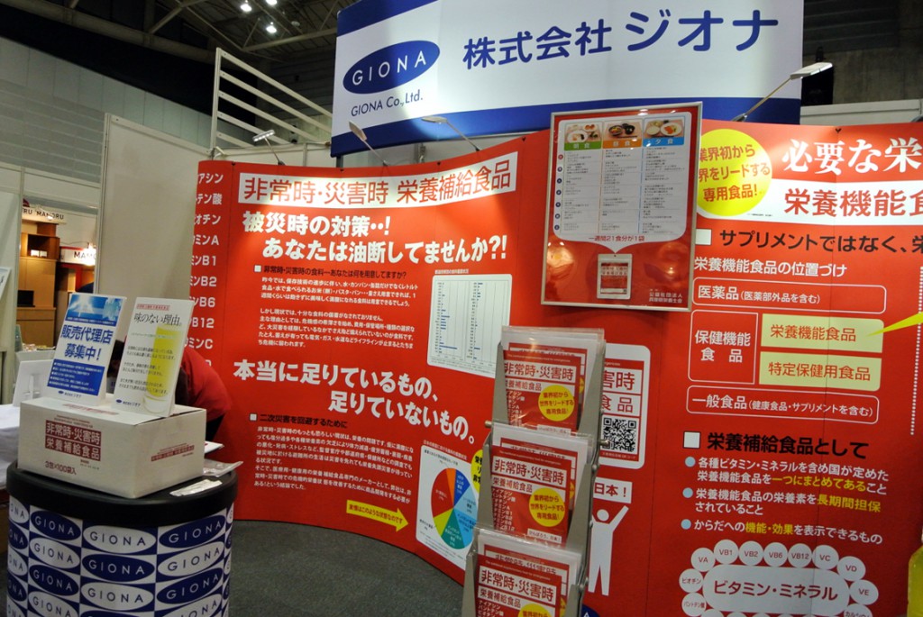 ジオナブースでは、災害時の栄養補給食品が紹介されていた。