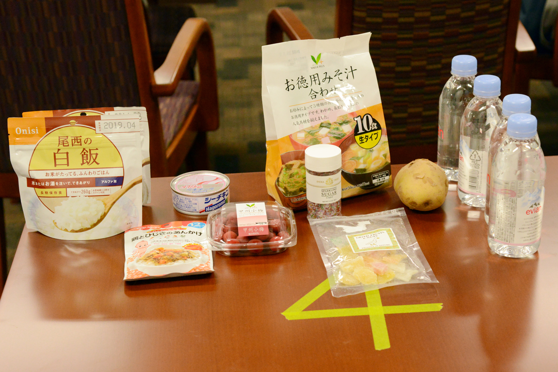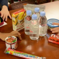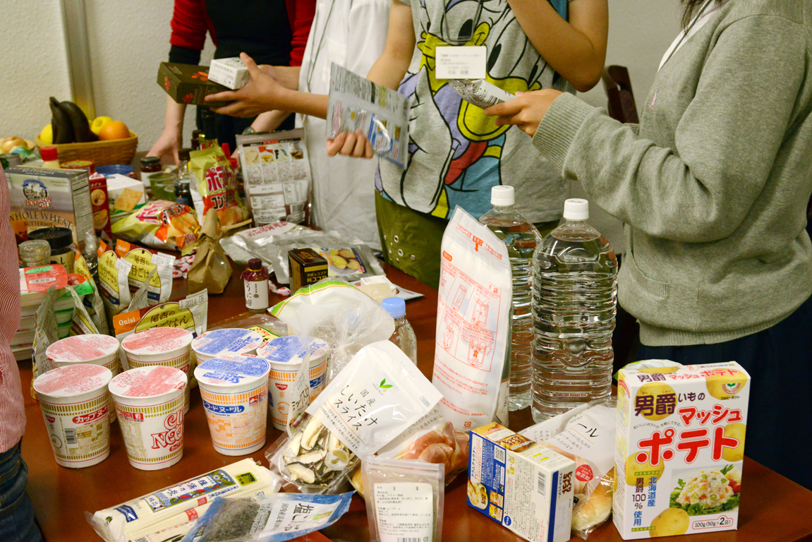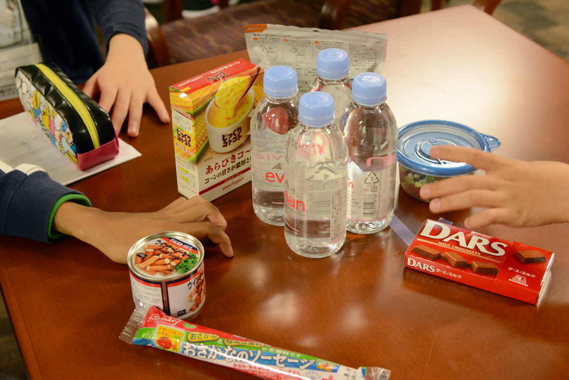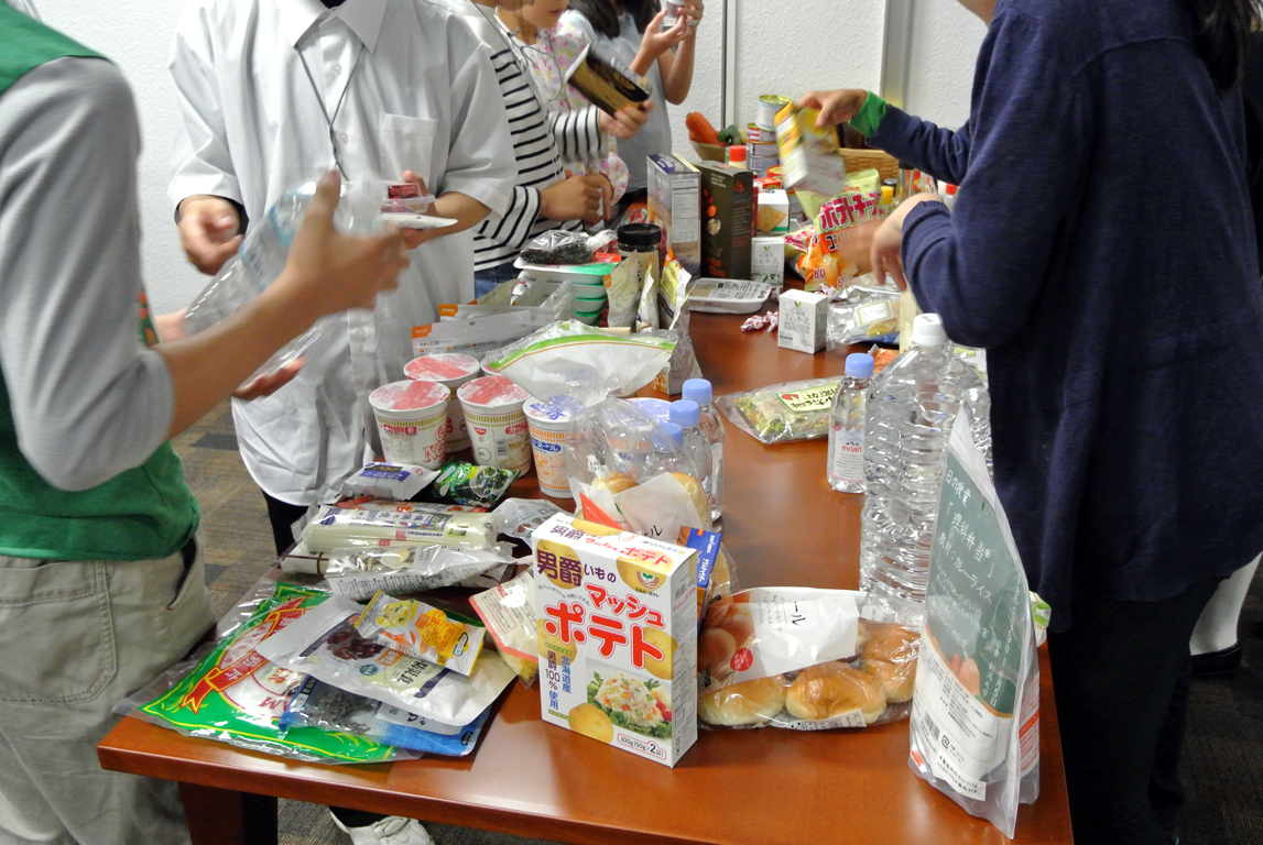 とは言っても、日持ちのする野菜や缶詰、菓子類なども含めて2週間分があれば良いという事で実際に1日分の食料備蓄を考えてみようというアクティビティ(実習)が行われました。中央のテーブルに用意された様々な食料を好みや保存性などを考えてグーループで相談して選びました。好きな食べ物やお菓子、果物などを用意するグループや、缶詰など保存や栄養素など機能重視で選ぶグループなど、テーブルごとに個性が出ていました。選んだ後は講評が行われて、カップ麺やフリーズドライ食品などは調理のためのお湯などが必要で、飲料水とは別に必要である事や、お湯を沸かすための燃料や容器も必要であるなどの補足事項も説明されました。なによりも、災害直後から当面の防災(非常)食料には、栄養素やエネルギーの摂取という面だけでなく、お菓子や好きな食べ物などを入れれる事で、災害の直後で沈んだ気持ちを少しでも明るくする、ちょっと嬉しい気持ちになるような工夫も必要だと日常と非常時の食べ物の選び方の違いなども説明がありました。