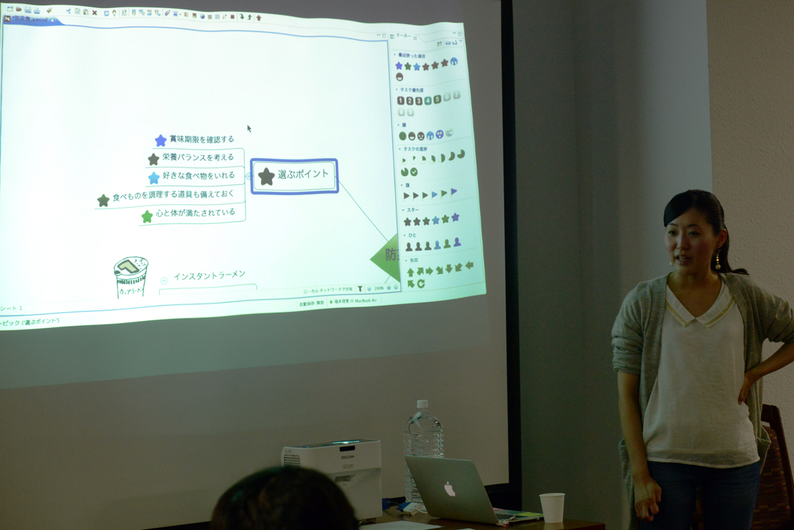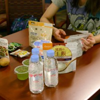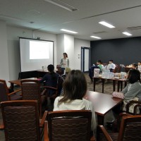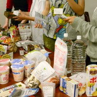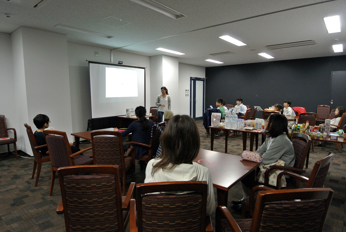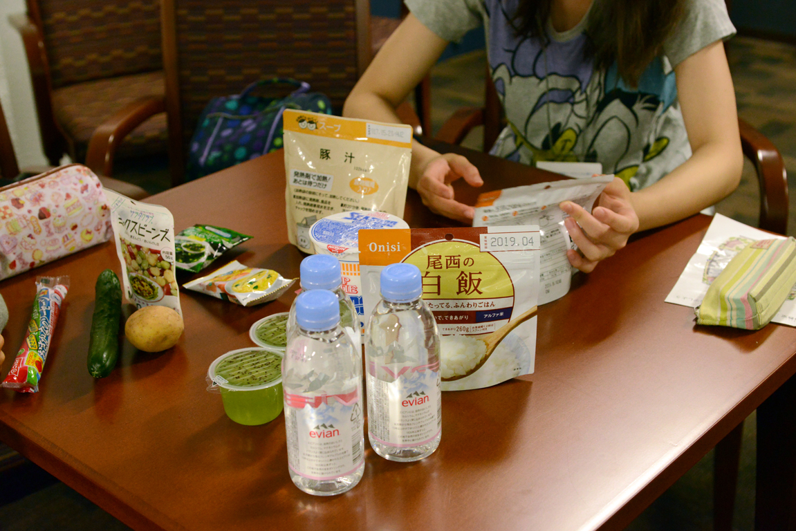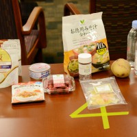 とは言っても、日持ちのする野菜や缶詰、菓子類なども含めて2週間分があれば良いという事で実際に1日分の食料備蓄を考えてみようというアクティビティ(実習)が行われました。中央のテーブルに用意された様々な食料を好みや保存性などを考えてグーループで相談して選びました。好きな食べ物やお菓子、果物などを用意するグループや、缶詰など保存や栄養素など機能重視で選ぶグループなど、テーブルごとに個性が出ていました。選んだ後は講評が行われて、カップ麺やフリーズドライ食品などは調理のためのお湯などが必要で、飲料水とは別に必要である事や、お湯を沸かすための燃料や容器も必要であるなどの補足事項も説明されました。なによりも、災害直後から当面の防災(非常)食料には、栄養素やエネルギーの摂取という面だけでなく、お菓子や好きな食べ物などを入れれる事で、災害の直後で沈んだ気持ちを少しでも明るくする、ちょっと嬉しい気持ちになるような工夫も必要だと日常と非常時の食べ物の選び方の違いなども説明がありました。