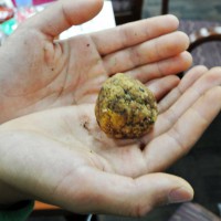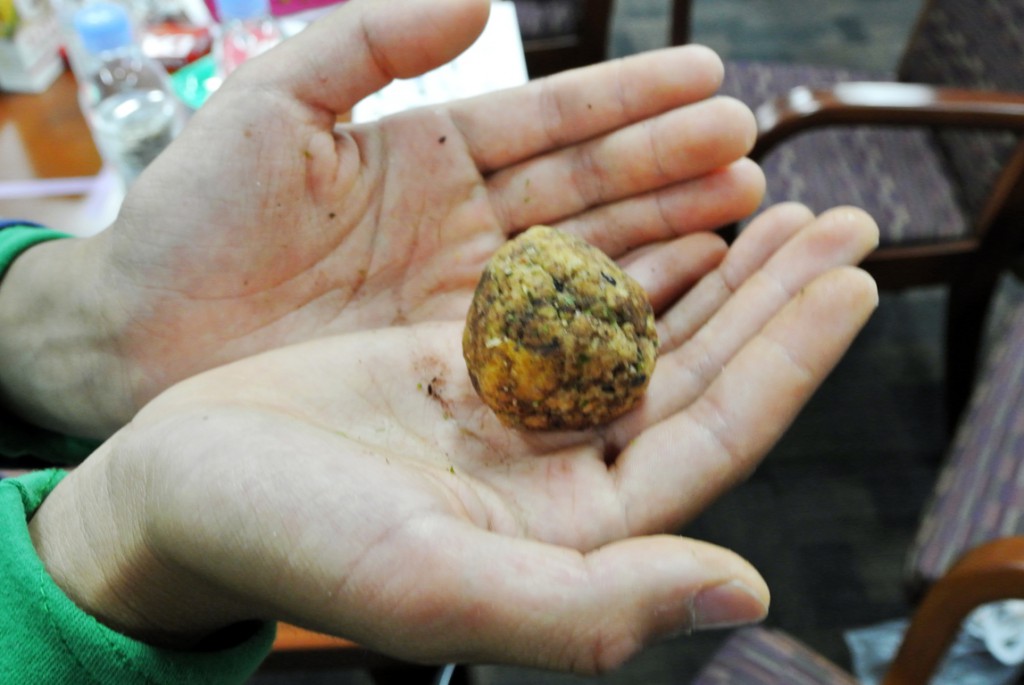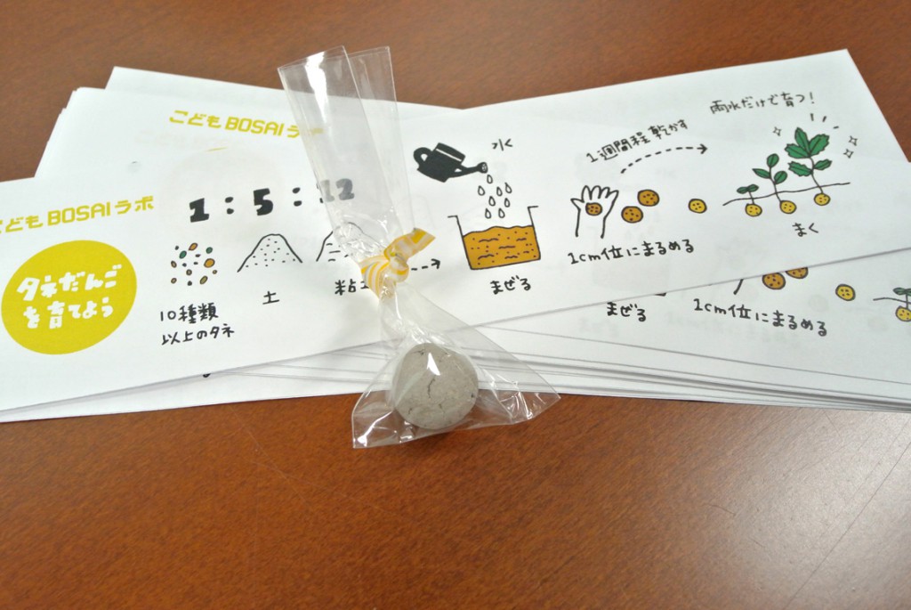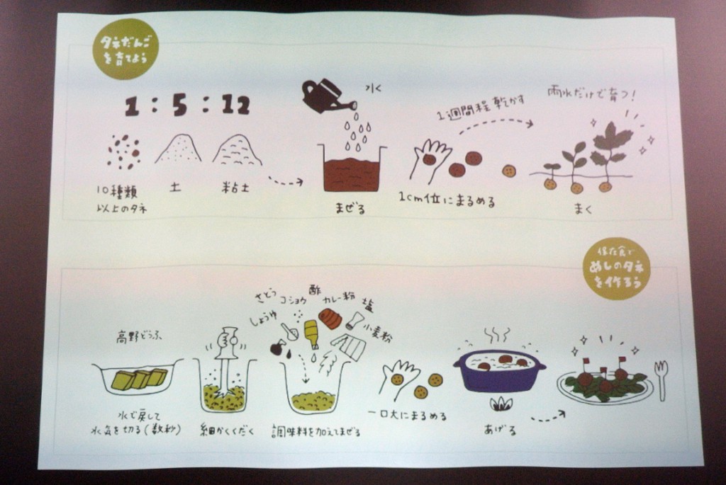 その後、備蓄した非常食の選び方ポイントなどが解説された後、長期の食料不足に対応するために、短期間で成長する植物の種子を備えておく事が提案されました。タネ団子と名付けられた10種類以上の種子と土、粘土を混ぜ、団子状に丸めたものは、土に埋める事なく地面に撒いて水を与える事で発芽、成長するという事です。もちろん、これだけではお腹いっぱいにはなりませんが、野菜分が不足する非常時に、パセリやバジルなどの添え物があるだけでも違うのでは?という話でした。
