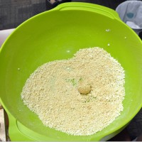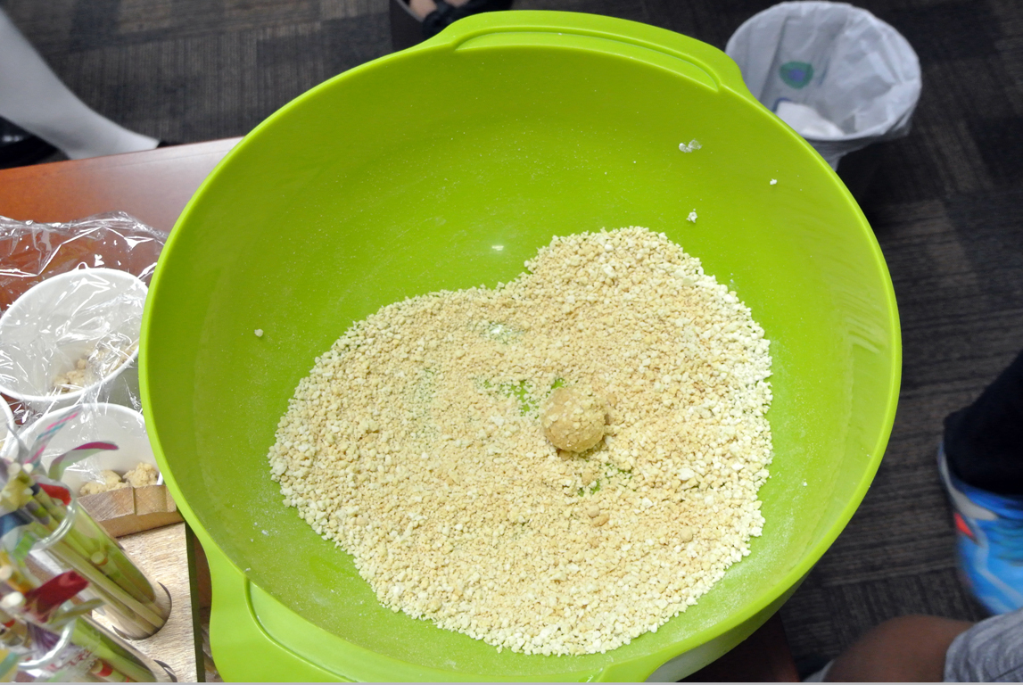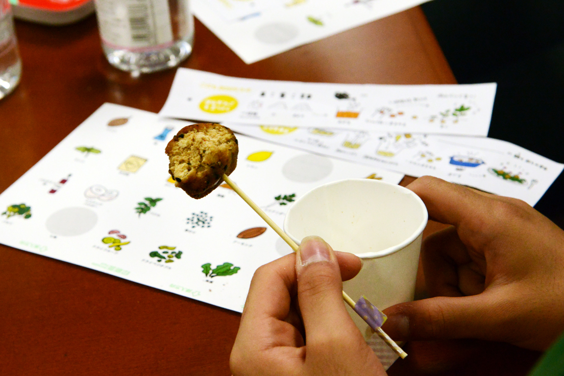 最後に、高野豆腐を使用した防災食を作るアクティビティが行われました。高野豆腐が素材として選ばれる理由は、乾燥していて日持ちがするという事と、豆腐を乾燥させたもので栄養価が高いという事からだそうです。今回は、塩や醤油などで味付けした「おかず」としての「ハンバーグ」と、ココアパウダーや砂糖などで味付けした「スーイーツ」としての「ドーナツ」のどちらかを選んで作る事になりました。