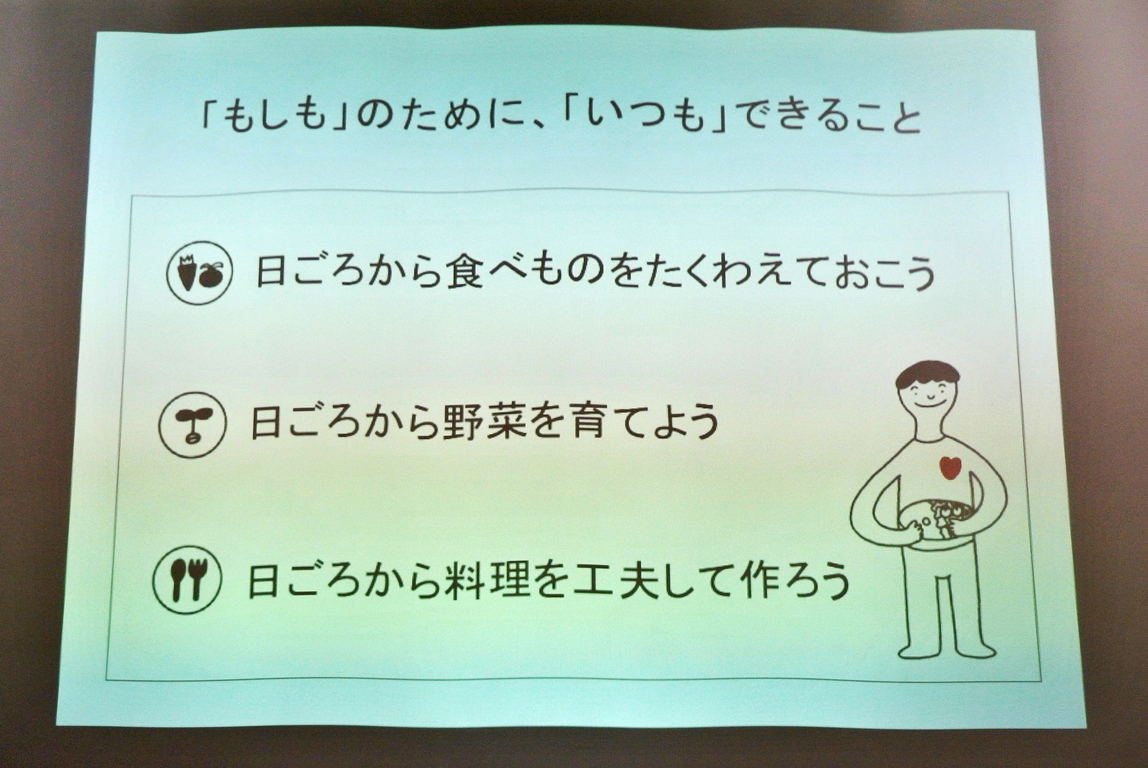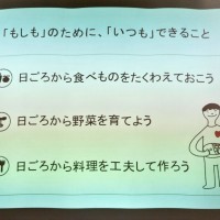 最後に、日頃からの食料備蓄はもちろんの事、家庭菜園までゆかなくともベランダ菜園のようなレベルでも野菜などを育てておく習慣を付ける事、小中学生でも工夫をして料理する事が大事だという事がまとめとして説明がありました。