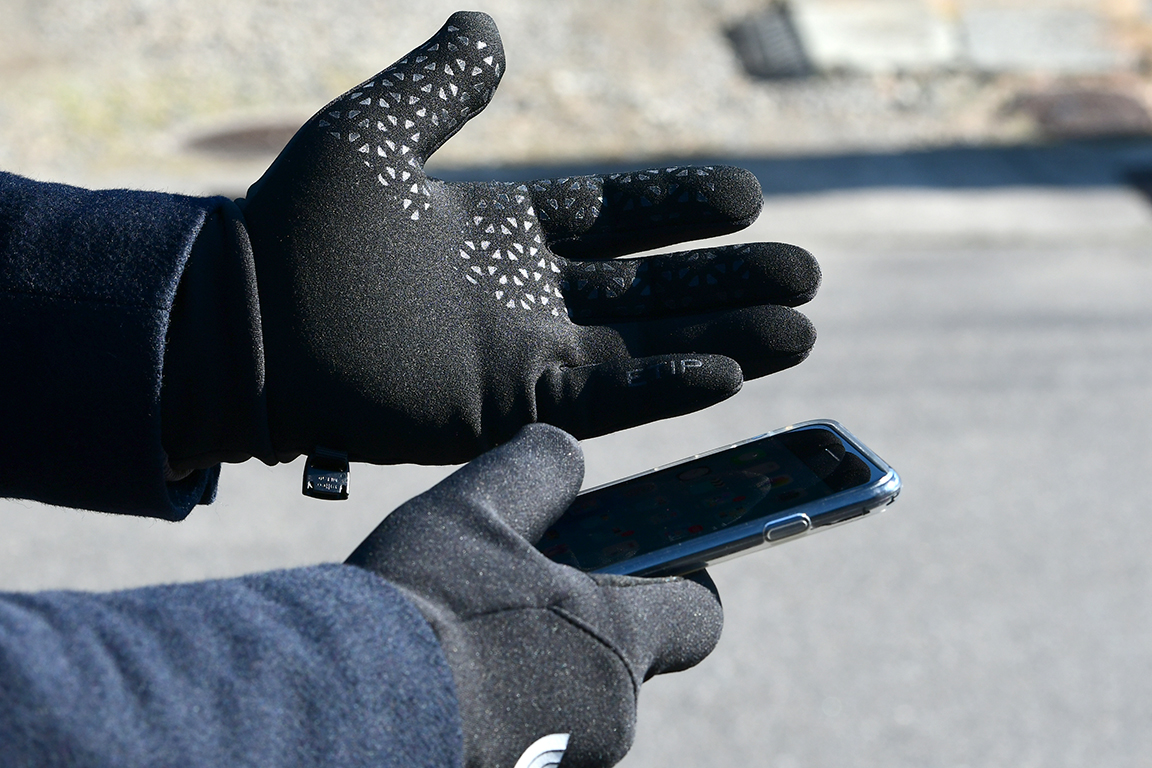 防水、防風性能は無いので、強風にさらされたりすると寒いし、雨や雪で濡れると染みてくるので、そういった場合には薄手の防水、防風のアウターグローブを使用すると良いだろう。もちろん、スマートフォン対応であれば(指先だけの場合が多いが)最低限の操作は可能になる。