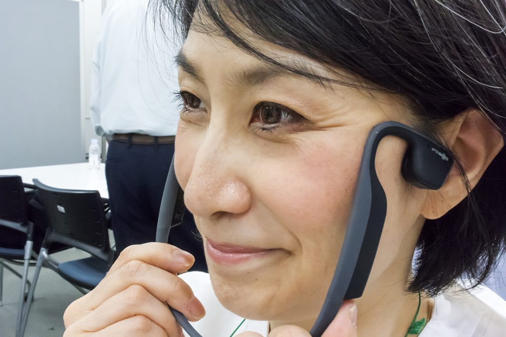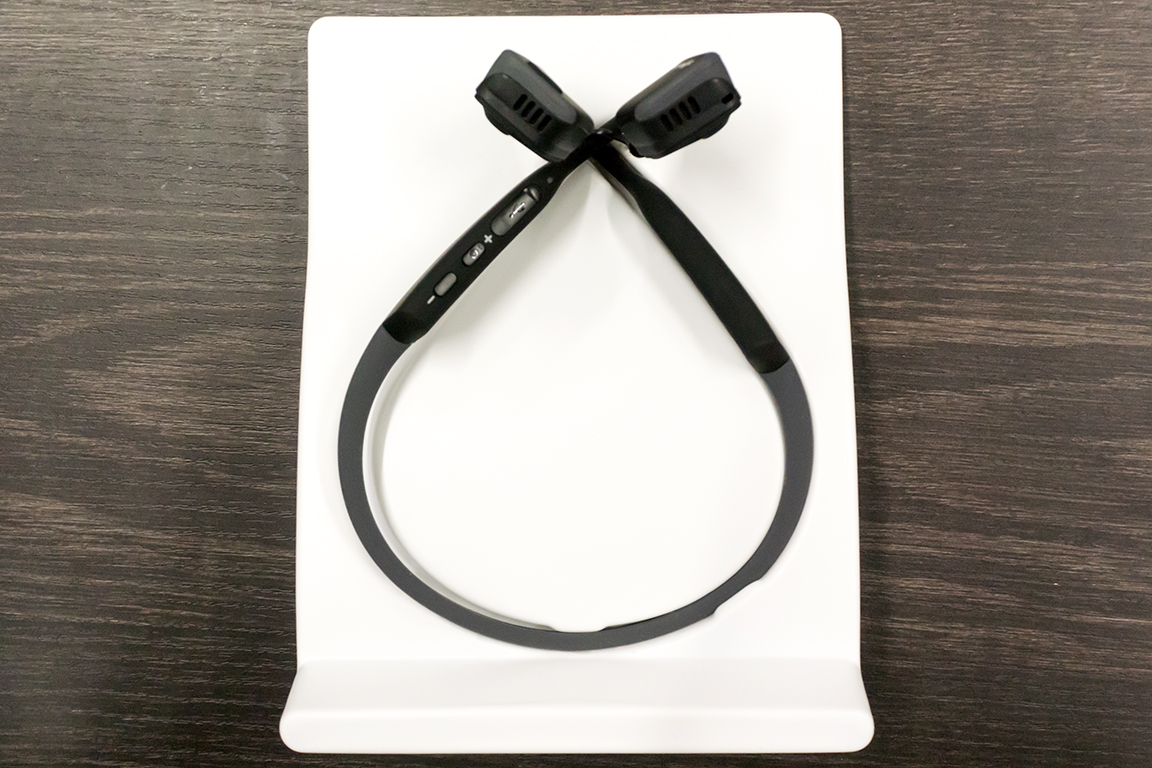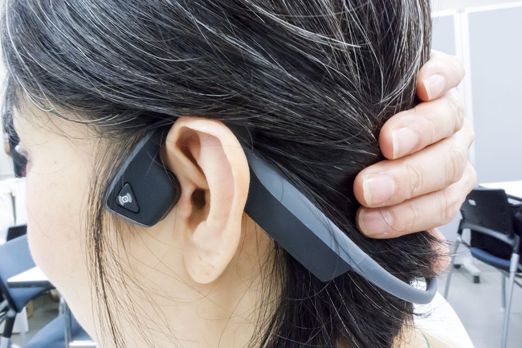 形状は、骨伝導タイプによく見られる耳掛けタイプ。振動ユニットが頬骨付近に接し、鼓膜を経由せずに内耳、聴覚神経に音を届けるというもの。
