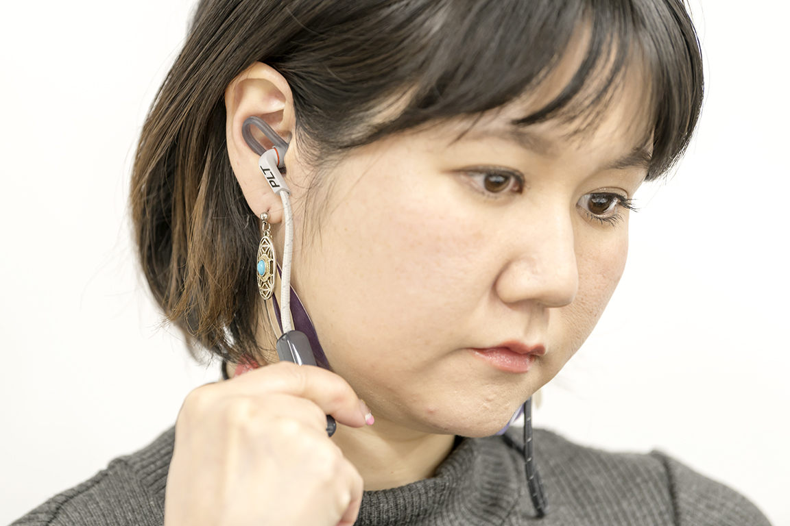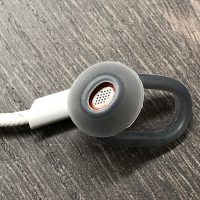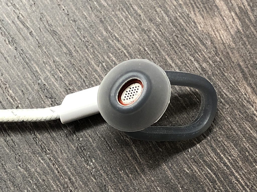 楕円型のイヤーチップ。スタビライザーと相まって装着時の安定性が高い。楕円型のイヤーチップは、使い始めは不思議な感覚があるが、慣れるとフィット感の良さが実感できる。ジョギングなどの際には、安全のために完全に耳を塞ぐのは望ましくないが、ゆるめに装着した場合でも耳からこぼれにくいのは嬉しい。