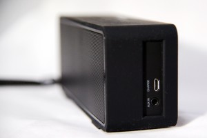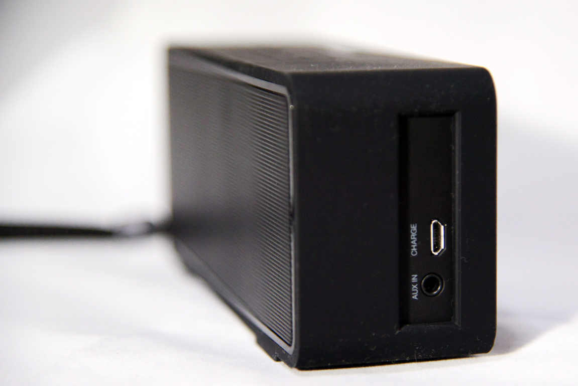 シンプルで飽きの来ないデザイン。ボディがラバーで覆われており、ボディそのものがインシュレーターの役割を果たして音が割れたりビビる(ビリビリと机などが振動する)事も防いでいる。1200mAhのリチウムポリマーバッテリーを内蔵し、バッテリーでの駆動は、50%の音量で約6時間。最大で12時間の再生が可能と充分。充電は約3〜4時間で完了する。