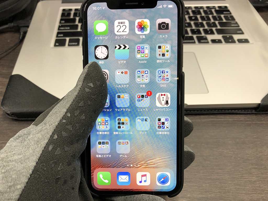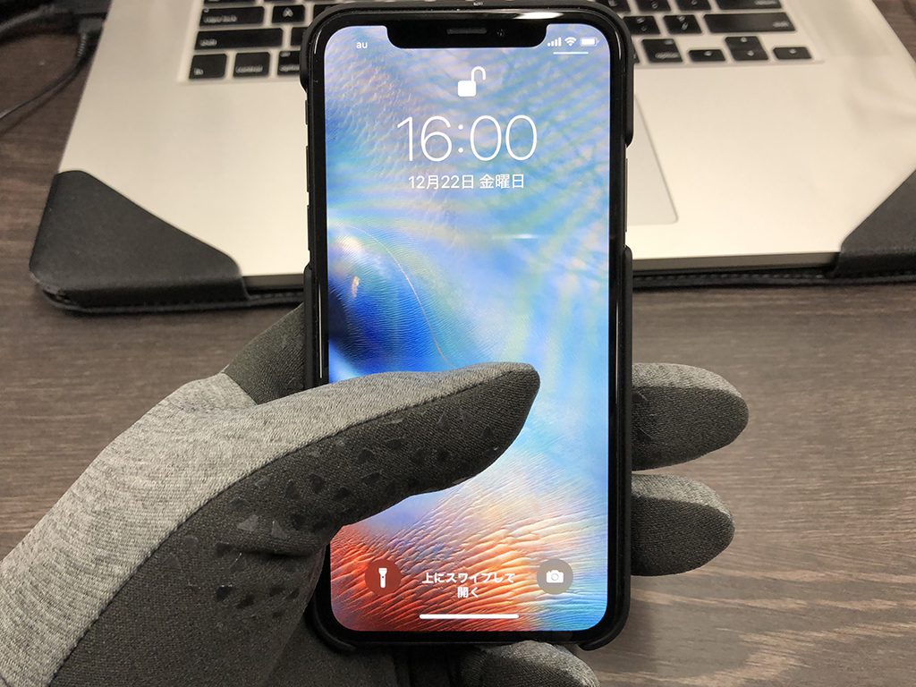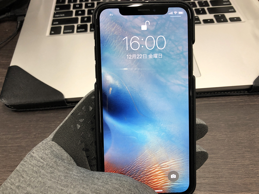 iPhone Xにて(素手でも手袋をしていても同様の動作で)FaceID認証をさせたあとは、上スワイプで待機画面を開けることができる。