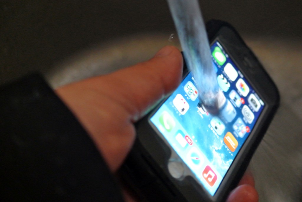 実際に水中に入れてみたところ。アウトドアで想定される浅い川や水たまりに落としてしまうシーンをイメージしているが、この程度ではもちろん浸水もせず、水中でのある程度の操作も行える。